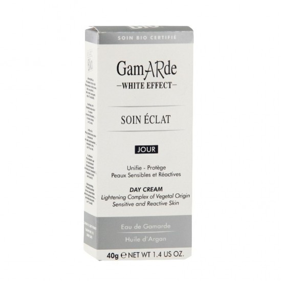 White Effect Soin Eclat Jour de Gamarde, est un complexe éclaircissant d'origine végétale qui cible les imperfections pigmentaires et redonne éclat aux peaux sensibles.
