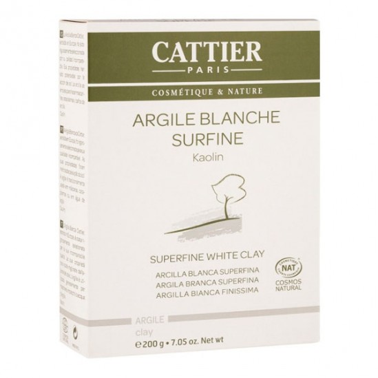 L’Argile blanche surfine Cattier, extraite dans le sud de l'Angleterre, a été rigoureusement sélectionnée pour son incomparable qualité. Elle est traditionnellement utilisée en masques ou en cataplasmes. Elle est transformée par des procédés mécaniques (concassage, broyage) et thermiques (séchage au soleil ou dans un four, autoclave...). Elle ne subit aucun traitement chimique et un contrôle rigoureux est fait sur chaque lot d'argile (couleur, aspect, granulométrie, microbio etc.).