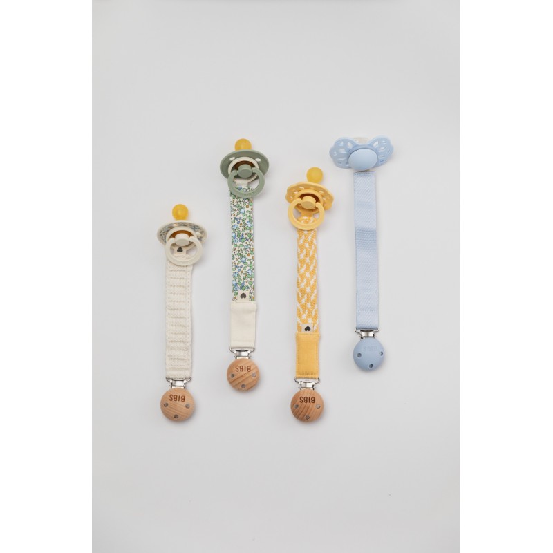 L’attache-sucette BIBS en coton bio se lave facilement à la main, pour rester propre, nette et prête à suivre bébé partout.
