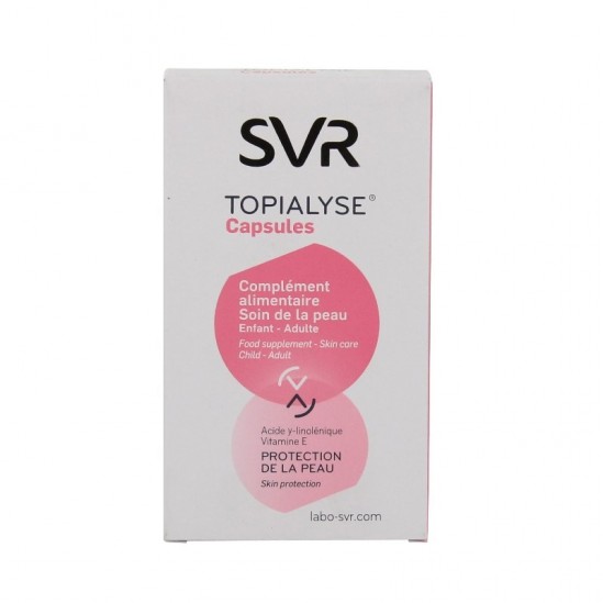 Complément alimentaire de choix des peaux sèches et atopiques, Topialyse Capsules restructurant, protecteur, permet à la peau de retrouver souplesse, élasticité et confort.