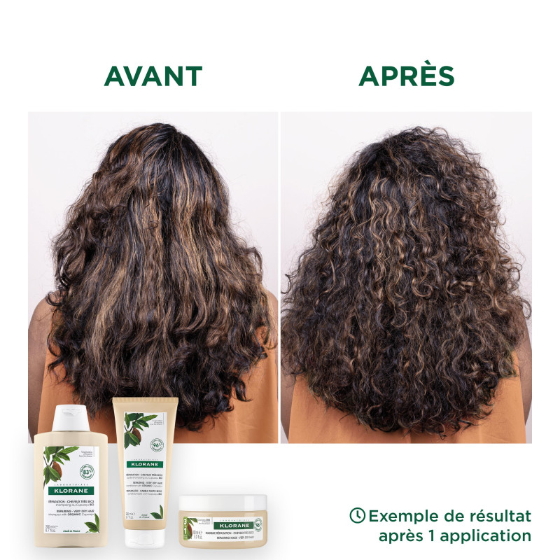 Le petit plus : Rincez à l'eau bien tiède. Si l'eau est trop froide, elle figera le beurre végétal en surface ; une eau tiède l'aide à fusionner avec la kératine pour un fini ultra-soyeux dès la sortie de la douche !