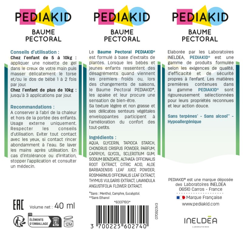 Sans Menthol, Sans Camphre, Sans Eucalyptol : Ces substances sont neurotoxiques pour les bébés. Pediakid garantit une formule sans aucun risque de convulsion.