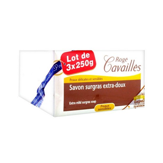 Rogé Cavaillès Savon Surgras Extra-doux Lot de 3 x 250 g nettoie en douceur et adoucit le visage et le corps des peaux sensibles et délicates de tous : bébés, enfants, adultes, personnes âgées.