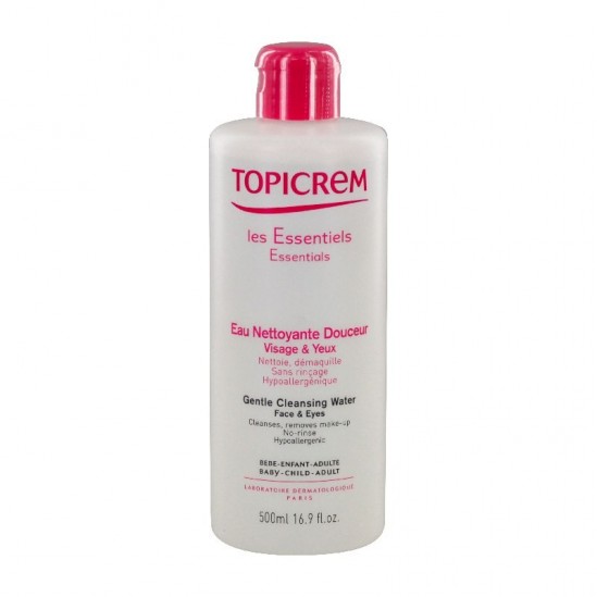 Topicrem Eau Démaquillante sans rinçage nettoie et élimine efficacement toutes les impuretés du visage et des yeux.