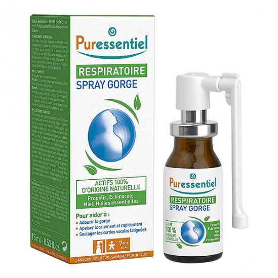 Le Spray Gorge Puressentiel Respiratoire contient de l'huile essentielle de menthe poivrée à l'effet apaisant sur la gorge, le pharynx et les cordes vocales, et de l'huile essentielle de thym qui aide au fonctionnement optimal du système respiratoire.