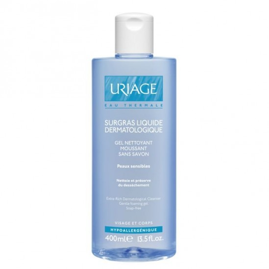 Le Surgras Liquide Dermatologique d’Uriage, gel moussant sans savon, nettoie sans agresser. Il respecte le film hydrolipidique et améliore le confort de la peau.