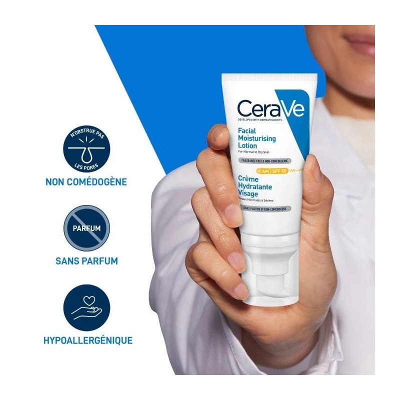 Protection SPF 50 (Large Spectre) : Une haute protection contre les UVB (coups de soleil) et les UVA (vieillissement prématuré), indispensable même en ville.