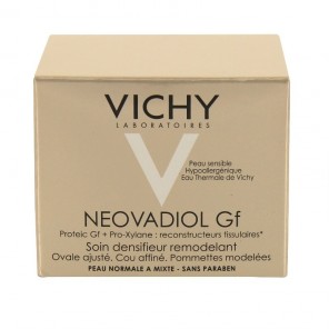 Vichy Neovadiol Gf est un soin densifieur re-proportionnant des peaux normales à mixtes, pour ajuster l'ovale du visage, affiner le cou et remodeler les pomettes. Cette crème est appropriée lors de perte de densité cutanée et des proportions du visage accentuée par le ralentissement hormonal.