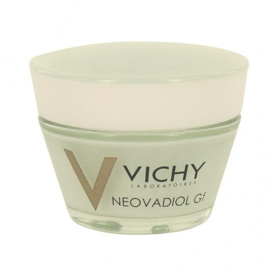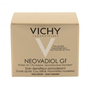 Vichy Neovadiol Gf est un soin hydratant densifieur re-proportionnant des peaux sèches à très sèches, pour ajuster l'ovale du visage, affiner le cou et remodeler les pomettes. Cette crème est appropriée lors de perte de densité cutanée et des proportions du visage accentuée par le ralentissement hormonal.