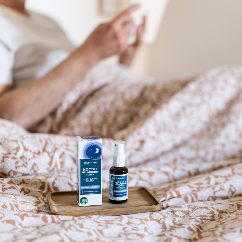 Dietaroma Nocta+ Flash Spray court-circuite ce processus. Son secret réside dans la technologie d'absorption sublinguale. En pulvérisant le produit directement sous la langue, la mélatonine et les extraits de plantes traversent instantanément les muqueuses buccales pour rejoindre la circulation sanguine. L'action est quasi-immédiate (15 minutes).