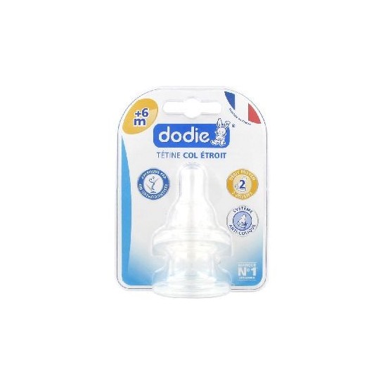 Dodie 2 Tétines Col Etroit +6 Mois 3 Vitesses Débit 1 est une tétine avec un embout succion adapté pour faciliter la préhension de bébé. Une tétine plus résistante grâce à sa fente anti-déchirure brevetée qui permet plus de sécurité. L'anneau d'étanchéité permet un bon positionnement de la tétine dans la bague du biberon afin d'améliorer le confort de la tétée. Système anti-coliques : 3 barrettes de régulation d'air à la base de la tétine pour une tétée en continue sans avaler d'air.