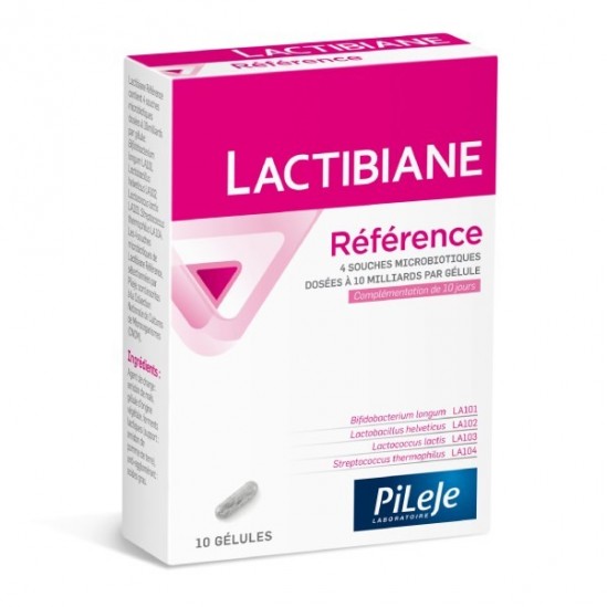 Lactibiane Référence est un complément alimentaire à base de 4 souches microbiotiques dosées à 10 milliards par gélule.