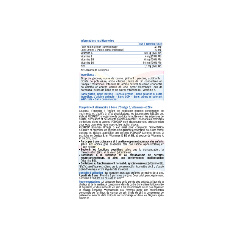 Pediakid a trouvé la solution parfaite avec ses Gommes Oméga 3. L'innovation ? Utiliser de l'Huile de Lin. C'est une source végétale d'Oméga 3 tout aussi précieuse, mais totalement neutre en goût. Fini les grimaces ! Cachés dans de petits oursons gélifiés au bon goût de citron, ces acides gras essentiels sont associés à un cocktail de vitamines "Spécial Cerveau" (B5, B6, Zinc) pour stimuler les fonctions cognitives. C'est le petit coup de pouce gourmand pour les aider à rester attentifs en classe et bien grandir.