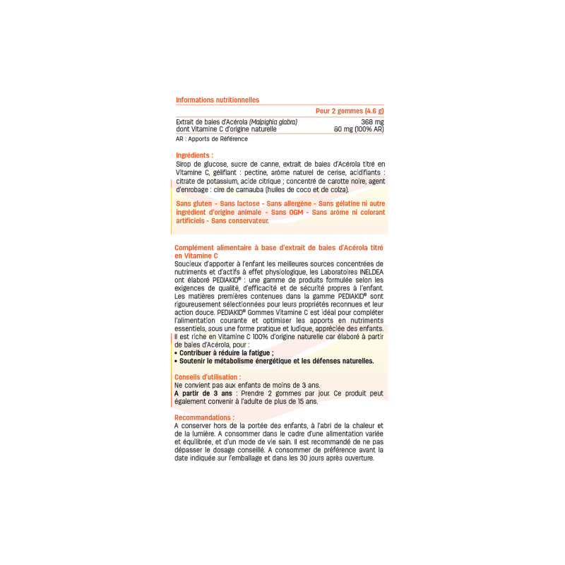 Pour recharger leurs batteries sans excitant chimique, Pediakid a sélectionné la meilleure source : l'Acérola. Pourquoi l'Acérola ? C'est une petite cerise des Antilles qui contient naturellement 20 à 30 fois plus de Vitamine C qu'une orange ! Pediakid l'a concentrée dans de petites gommes en forme d'oursons au goût de cerise. Contrairement à la vitamine C de synthèse, cette vitamine C naturelle est accompagnée de ses cofacteurs végétaux (flavonoïdes), ce qui la rend bien mieux assimilée par l'organisme et plus douce pour l'estomac. C'est le petit "bonbon santé" qui efface la fatigue et booste l'immunité en un clin d'œil.